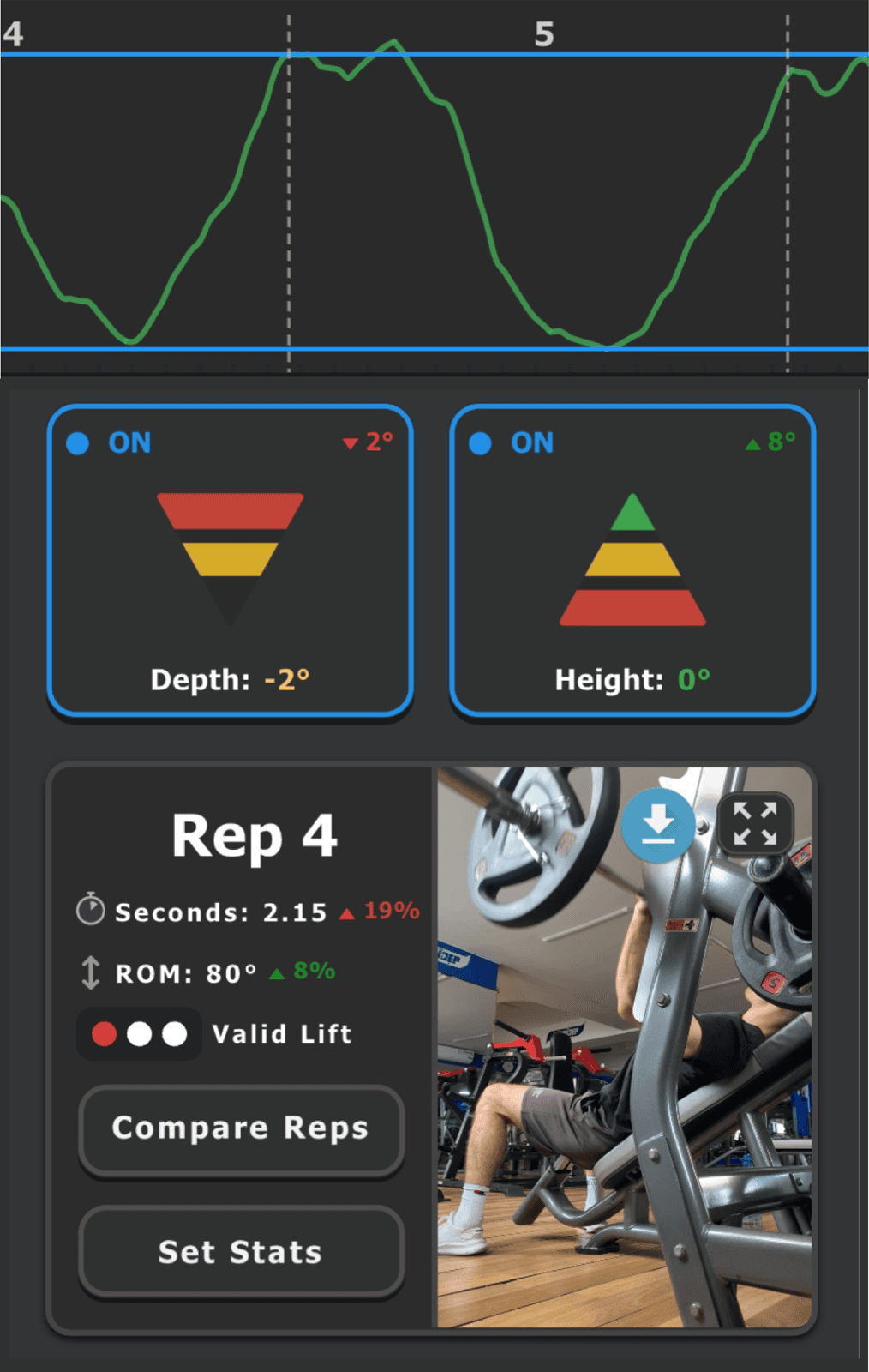 Set custom depth or height targets, and receive audio cues mid-set when you reach and/or pass them. After training, check whether each rep meets competition standards—including depth, range of motion, and downward motion.