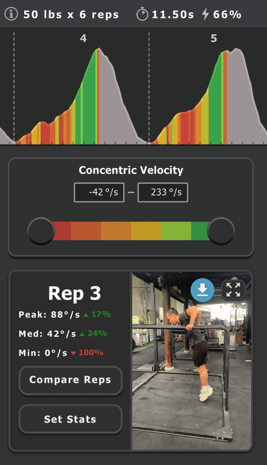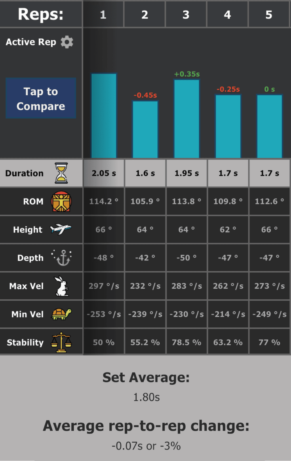 Track and analyze your performance with metrics including: Peak, median, and minimum velocity, range of motion, height, depth, stability and duration. These metrics are provided for each rep, along with set averages and rep-to-rep consistency.